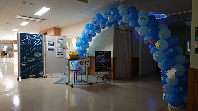 或る日、街のショッピングモールにミニ水族館が来ました。小さな水槽にきらきらお魚が泳ぐ様子に、水族館を是非患者さんに届けたいと思いました。そんな折、「ゆめ水族園」という活動を知り、令和6年度にはファンタスカーでの開園が実現しました。