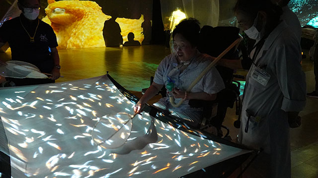 壁に床に天井にと舞い踊るように漂うお魚、ゆったりと水に遊ぶ白くまのホクトくん、形を変え光集める波。患者さん達は水中に溶け込んでいくように車椅子を進めて行き、水の中でも呼吸ができているような錯覚を覚えました。ただ、じっとそこで眺めるというとても贅沢な時間でした。