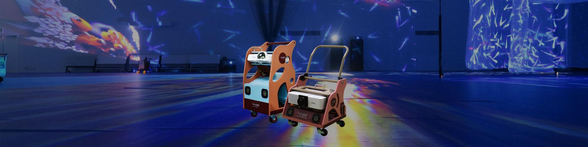 ファンタスカーには、プロジェクター、アンプ、スピーカー、動画コンテンツなど、ゆめ水族園の基本機能を搭載しています。スクリーンは皆さまの発想次第。電源をつなぎスイッチを押せば、ゆめ水族園の映像と音楽を楽しめます。