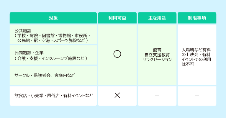 療育、自立支援教育、リラクゼーションでご利用いただけます。飲食、小売り、有料イベントなどではご利用いただけません。ご不明な場合は、お問い合わせください。