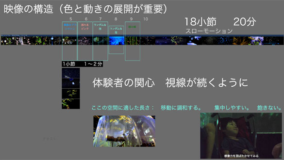 長い映像(カット)は集中力が続きません。誰でも飽きますよね。そこで体験する空間に合わせて長さを決めています。状況により一概に何秒がいいとは言い切れませんが、例えば1シーン20秒くらいです。それが変化していきます。