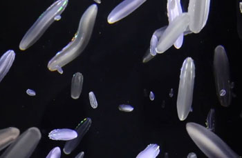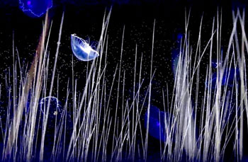 透過する布に映してみましょう。布を筒状に吊り下げると、そこは魚やクラゲに包まれる空間になります。魚や植物などの揺らぎと一緒にゆらいでみましょう。