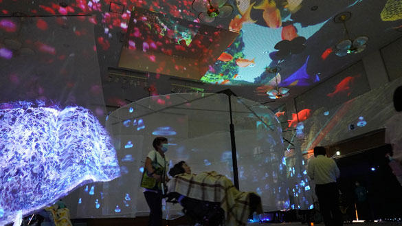 ゆめ水族園では、体験される方が普段から慣れ親しんでいる施設の部屋を会場としています。体育館やプレイルーム、病室など広さや形状はさまざまです。ゆめ水族園は、代表的な9つの映像空間の組み合わせ方を会場や体験される方に合わせて変化させそれらの調和を取ることによって、その施設固有の感覚刺激体験を作り出します。