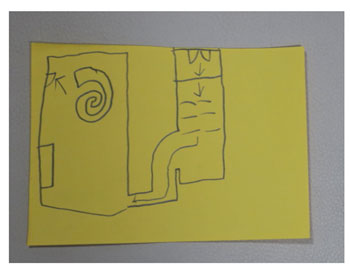 下の絵を見てください。これは、特別支援学校の生徒さんがゆめ水族園体験後に描いた絵です。会場の図面と比較しても明快に空間把握をしていることがわかります。渦巻きのスクリーンがあり部屋の数や渡り廊下までもが印象づいている感じが読み取れますね。この生徒さんは美しい魚より複雑な迷路のような空間そのものに興味を抱いたのでしょう。自由に会場の空間を探索した感じが読み取れます。また自分が移動した形跡とも読み取れます。「面白い空間だったよ」「こんな探検をしたよ」「これだけ動いたよ!」と、そんなメッセージが聞こえてきそうです。