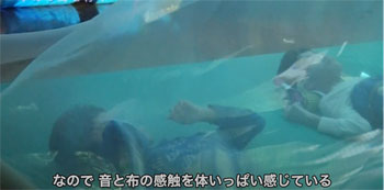 特に見えない方、見えにくい方でも揺れるスクリーンを感じたり音を聞いたりすることで空間を把握することは十分できると考えています。音や映像を使いながらも、スクリーンによって、まさに触覚空間を作り上げることが重要です。下の写真は、柔らかなスクリーンに触れることで自分の周りを把握し自分との関係性を楽しんでいる様子です。