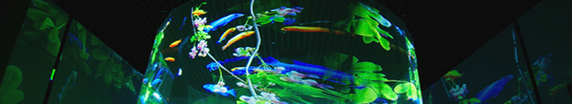 ゆめ水族園では、包み込むように色鮮やかな魚や木々の揺らぎなどの映像と音楽で空間を満たします。