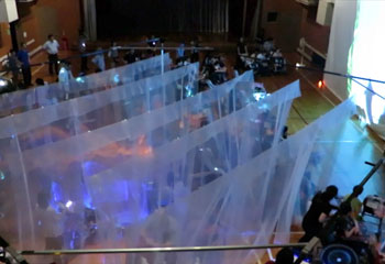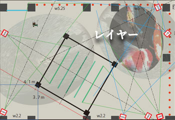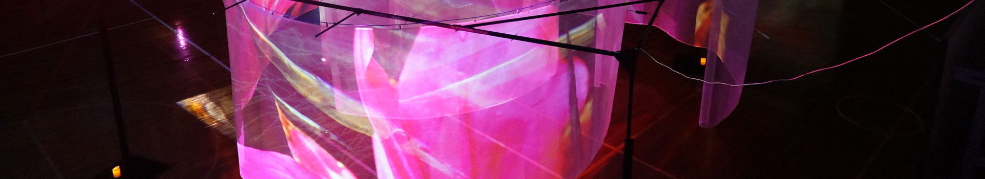 「レイヤー」とは、オーガンジーなどの生地で構成する柔らかく半透明のスクリーンを文字通り層状に連ねた構造で、映像空間を深さ方向に形成して奥行き感を作り出します。同時にスクリーンの間に設けた空間に入り込むことでスクリーンと触れることができる、触覚型映像空間の原型と言えます。また、オーガンジーは上側を固定するだけで吊り下げているため、部屋の空調の風によってこれが揺れ映像空間に揺らぎをもたらすのもこの空間の特徴です。