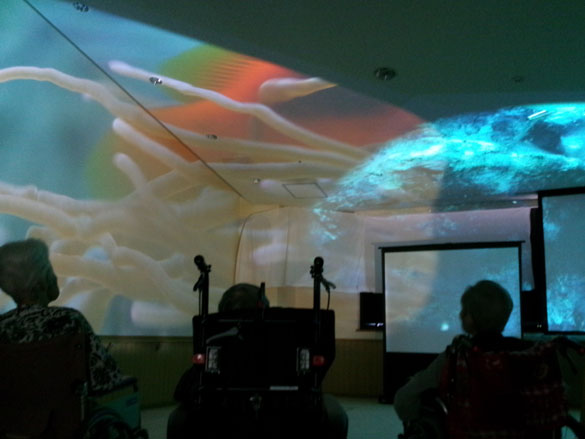 暮らしの場である特別養護老人ホームの生活リズムの中では、忙しい介護職員の皆さんが対応可能な形態という意味でもこの流しっ放しという方法が一番マッチしているのではないかとのお話でした。暗い中で心地よい映像と音楽に包まれて寝入ってしまう方もいたそうですが、副施設長さんによるとこれはこれで、リラックスできている状態の現れであって良い効果とのことでした。