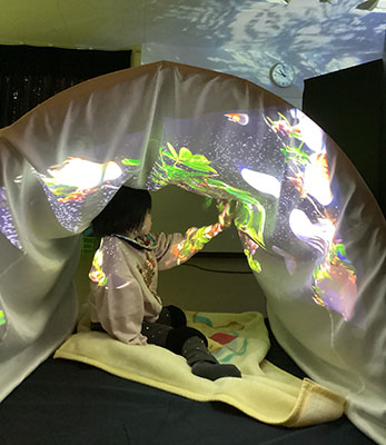 普段の授業で使っているトンネルを利用!狭いトンネルの空間の中でゆっくりと映像を楽しんだり、触れてみたり…。人気の空間となったようです。
