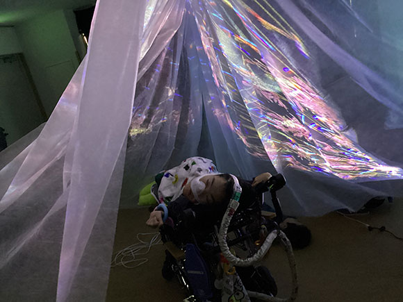 「⼦どもの障がいの程度は多種多様。もっている感覚のうち、どれを使って刺激を受け取り、どんな風に表現しようとしているのかを探る活動を考えたい。」授業として取り組むことにこのような目的を持っていた先生方。繰り返し実施することで、子どもたちの反応をじっくり観察することができ、実態に合わせて授業を作ることができたそうです。「1回目の授業での様子では考えもしないくらい変化を感じた。子どもたちが環境に慣れ、自発的に活動する姿が毎回楽しみであった。それらが次の工夫につながった。」という感想もいただきました。