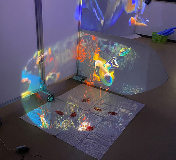 魚の形をした保冷剤を床に置き、そこに映像を投映。見るだけではなく触ることで多様な感覚を使えるように工夫。