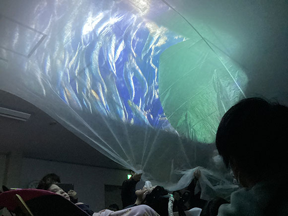 また、このお魚バルーンに使っているのは先ほど紹介した不織布のスクリーンです。あるものをどんどん利用して新たな映像空間を作り上げていく先生方の姿は、私たちにも学びの場を提供してくださいました。