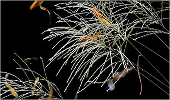 ① 透けるスクリーンに投映された黒は透明に見えます。その特徴を利用し、背景を黒くして魚や花のオブジェクトに浮遊感を与えます。