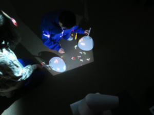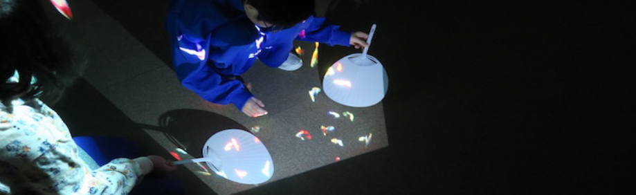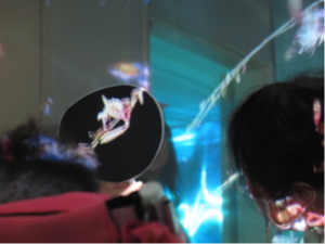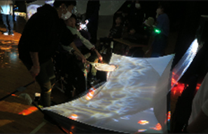 こうして作ったハンドスクリーンはゆめ水族園のイベントで使用しています。ハンドスクリーンをプロジェクターから出る光に向けると、スクリーン上に魚などが映り込んで、まるで魚をすくっているようだと好評です。
