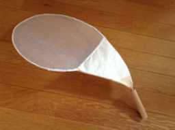 写真では、自然の線を活かす、感触の質感を高めるなど考慮して木の枝を曲げて本格的に作っています。そこに木工用のボンドなどで布を張り込んでいます。枠を作るのが難しければ、ウチワのようなものにスクリーンを張り込んでもいいでしょう。