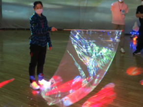 ハンドスクリーンには写真にあるような旗状の揺れるスクリーンもあります。これは利用者さんに使ってもらうというよりも、空間で映像を捕まえながらそのスクリーンの触感を利用者さんに感じてもらうために使用します。