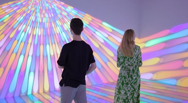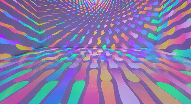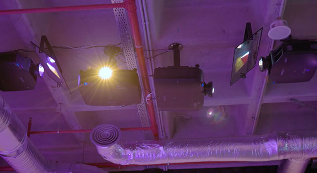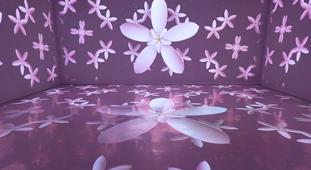 Eight projectors are installed on the walls and six on the floor to create an immersive environment. These projectors form a single unified canvas with images seamlessly blended together.