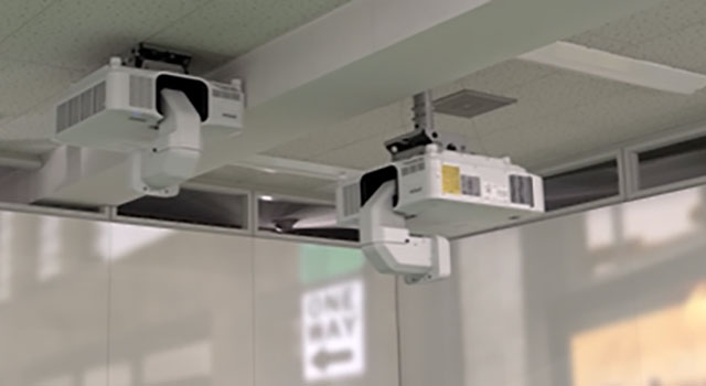 To create an immersive VR learning space, Omori Higashi Elementary School installed four high-brightness projectors (EB-PU2113W) with ultra short-throw, zero-offset lenses (ELPLX02WS) and dedicated mounts (ELPMB67). These devices were chosen for their ability to deliver clear images even at moderate brightness levels—ensuring student safety—and for maximizing projection size within limited classroom space. The setup enables seamless visuals across three partition walls, enhancing immersion and realism in English lessons.