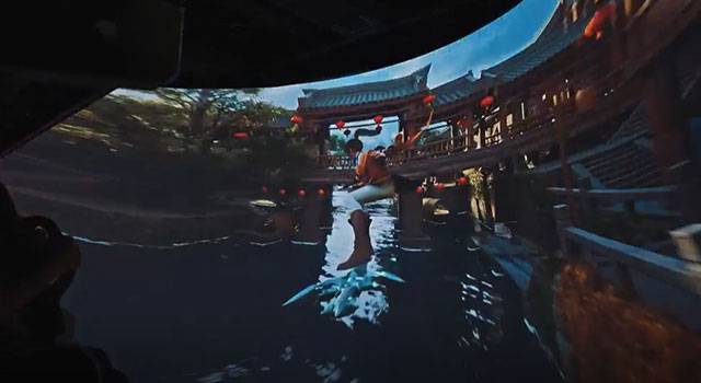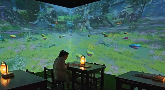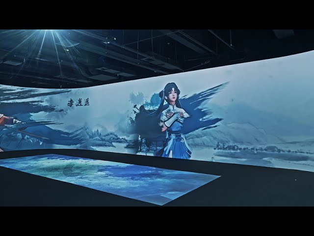 The exhibition features five projection-based spaces, including a CAVE immersive environment, a semi-enclosed wall projection, a 270-degree spherical screen combined with an 8D flying seat, and two interactive spaces.